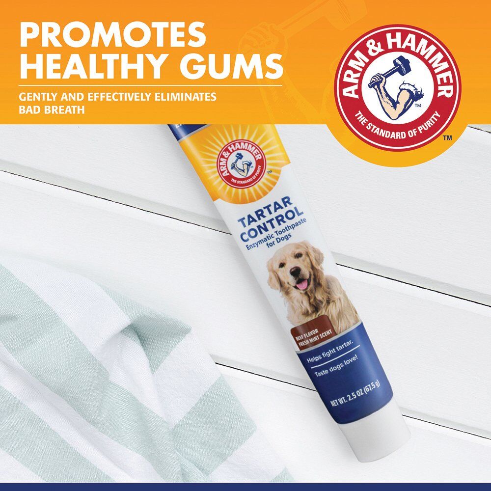 The Arm and Hammer advanced care enzymatic toothpaste for Dogs is designed specifically to remove and prevent plaque buildup. Baking soda cleans and deodorizes while enzymes fight tartar. This advanced care toothpaste whitens teeth, fights tartar buildup and eliminates bad dog-breath, keeping your dog's teeth in top form. This Dog Toothpaste is formulated with natural ingredients for Advanced Oral care and is Beef flavoured to make brushing enjoyable for your dog, leaving a pleasant mint scent to fight bad dog-breath.
