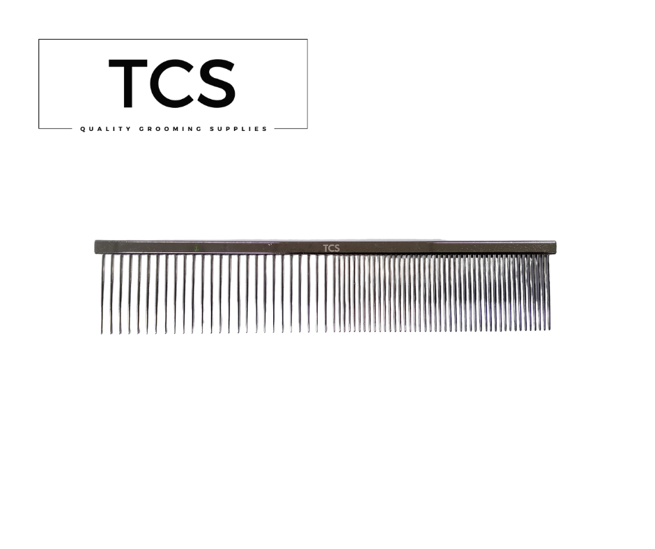 TCS Stainless Steel Electroplated 50/50 Pet Comb - 19cm long - Electrocplating of stainless steel tines assisst in reducing static when combing and slides easier through your pets hair - great for detangling and finishing off your pets coat.