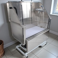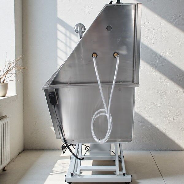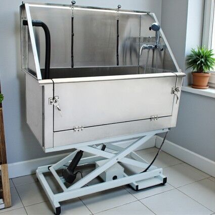 Electric Lift Stainless Steel Pet Grooming Bath with drop down front door.
