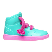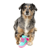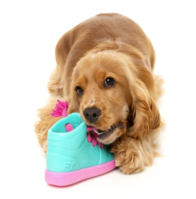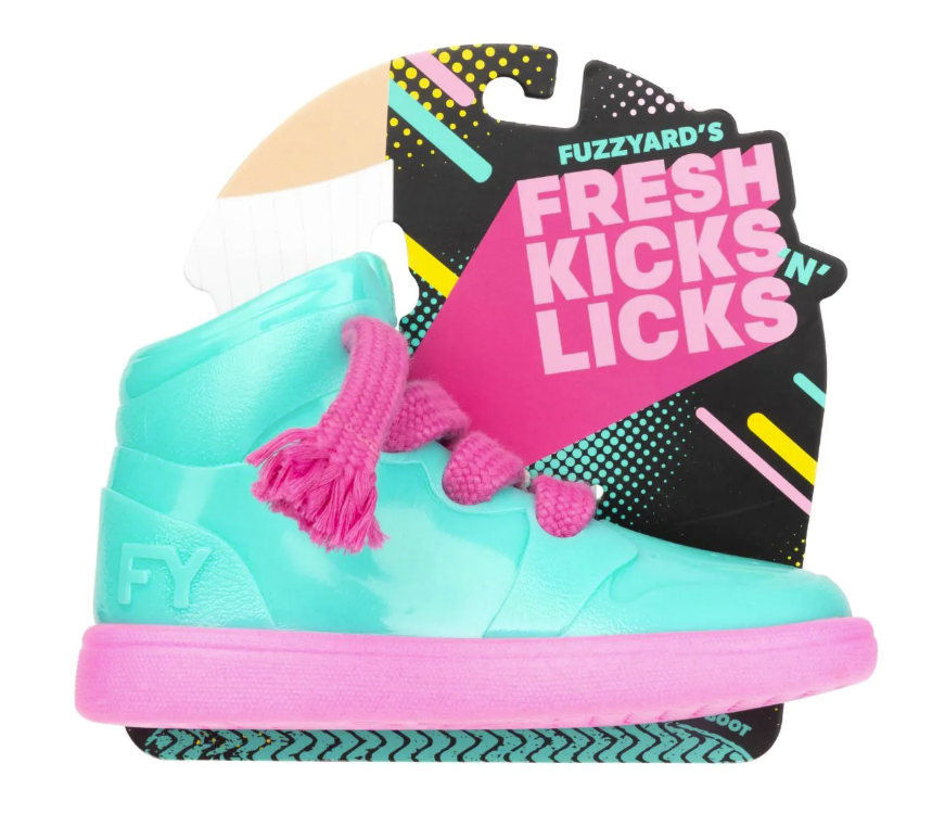 Give bad breath the boot with FuzzYard's Fresh Kicks 'n' Licks. Finally, a shoe your ALLOWED to chew on! Featuring rope laces that floss teeth, and a licki groove sole for filling with paste and scrubbing tongues, our shoe toy is the least boring way to maintain good oral hygiene. FLOSS, CLEAN, AND CHEW! - this sneaker really does it all. While other brands may have ok chew toys that clean your pets teeth - THIS IS THE COOLEST WAY TO DO IT!! Why chew on a boring ball when you can gnaw on a sneaker fresher than the one on your mum or dads feet! Street style, a funky colour combo and awesome features - this extra engaging chew toy is the ultimate 3-in-1 boredom buster for your pet. So kick boredom whilst you kick stinky breath - with FuzzYards Fresh Kicks n' Licks!