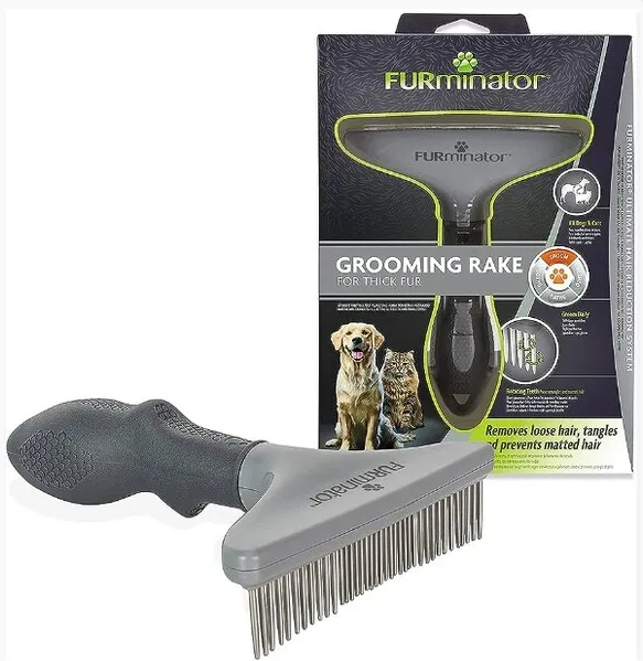 The FURminator® Grooming Rake has rotating metal teeth that remove loose hair from your pet’s undercoat. Best for dogs and cats with thicker fur, the FURminator® Grooming Rake helps prevent tangles and mats. The ergonomic nonslip handle gives you maximum control. Routine maintenance is important to keeping up with your pet and home. The FURminator® Grooming Rake provides a convenient daily solution for undercoat care. For best results, use with other FURminator® grooming products as part of a complete regimen.