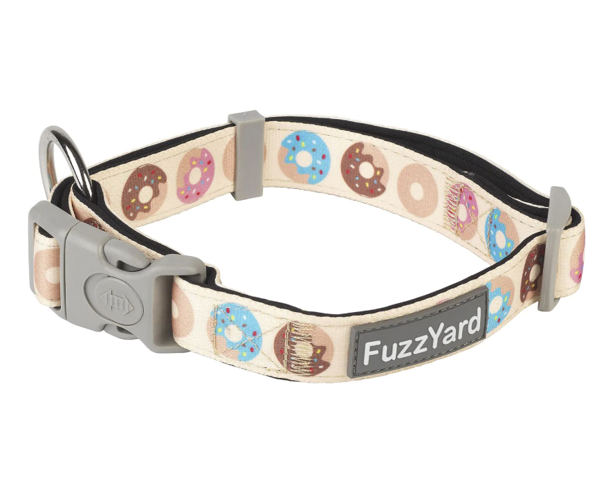 Go nuts for this tasty looking FuzzYard adjustable collar. Every collar features a sturdy die-cast attachment ring and thick cushioned webbing for durability and a comfortable fit. Complete the look by matching this with the rest of the Go Nuts range.