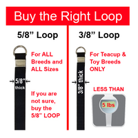 This grooming loop is perfect for working on small dogs and designed to work specifically with the Groomers Helper® Professional and Starter Sets. This pet loop now comes in 3/8 inch thickness! Includes a tight locking Stainless Steel Clasp and a D-Ring for connecting the grooming loop to the Groomers Helper® Tether. 19” Total Length. Recommended for Toys and Teacups only, 5 pounds and under.