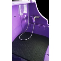 With an electrically adjustable frame, save your back and shoulders by controlling the height of the bath. The inside surface features a raised paw print pattern for extra grip. A removable mezzanine platform inside the tub also makes washing small dogs much easier with less strain on your back and shoulders.