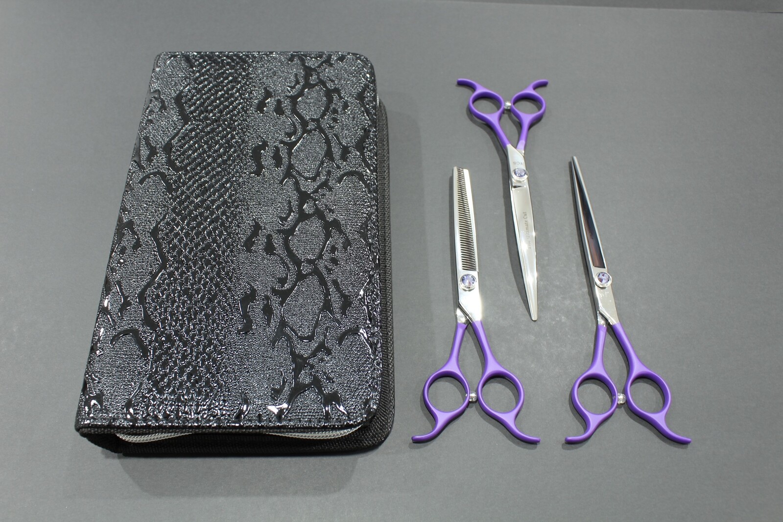 TCS Dovetail Pet Grooming Scissors Set of 3 with Purple Handle and Jewel Adjusting Screw