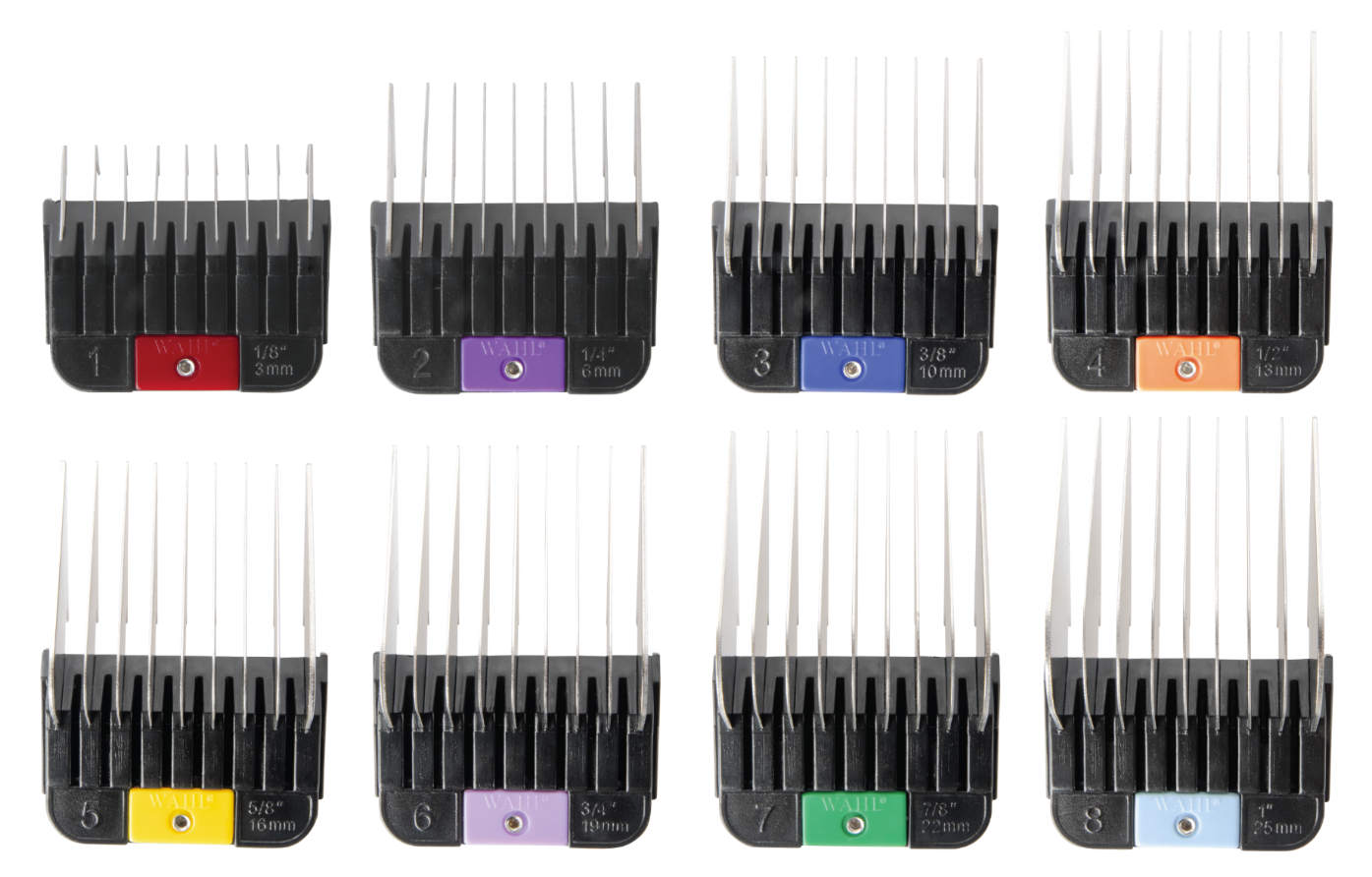 • 8 Attachment Combs (#1= 3mm, #2= 6mm, #3= 10mm, #4= 13mm, #5= 16mm, #6= 19mm, #7= 22mm #8= 25mm).