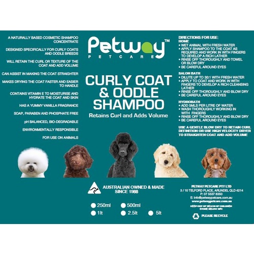 Petway Petcare's CURLY COAT & OODLE SHAMPOO is a naturally based shampoo concentrate designed specifically for curly coats and oodle breeds. It will retain the curl or texture of the coat and add volume. Makes drying the coat faster and easier to handle and it can also assist in making the coat straighter when drying if high velocity dryer is used. Contains added benefit of Vitamin E to moisturise and hydrate the coat and skin. Leaves a yummy vanilla fragrance.